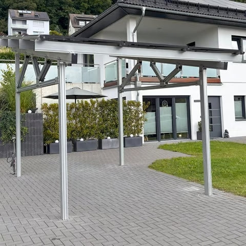 Stellen Sie sich vor, Sie genießen einen entspannten Nachmittag auf Ihrer Terrasse, geschützt vor Sonne und Regen durch eine elegante Überdachung. Doch das ist nicht alles – die smarte Steuerung passt das Licht perfekt an, während über Ihrem Auto im Solarcarport umweltfreundlicher Strom erzeugt wird.